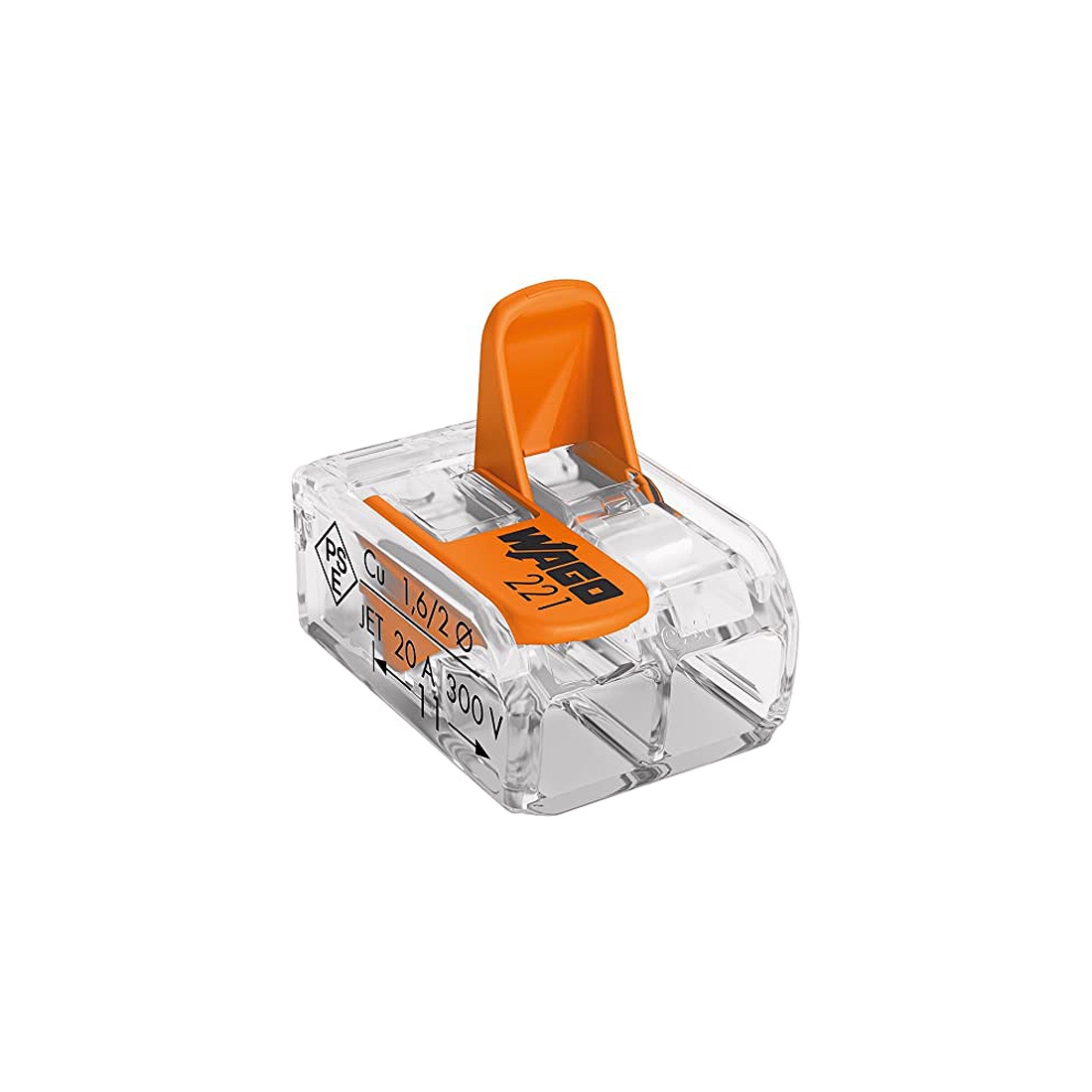 The Wago 221-412 compact lever operated connectors with CAGE CLAMP connect two stripped, fine-stranded conductors from 0.14 to 4 mm², as well as solid or stranded conductors from 0.2 to 4 mm² (24–12 AWG) – without tools!