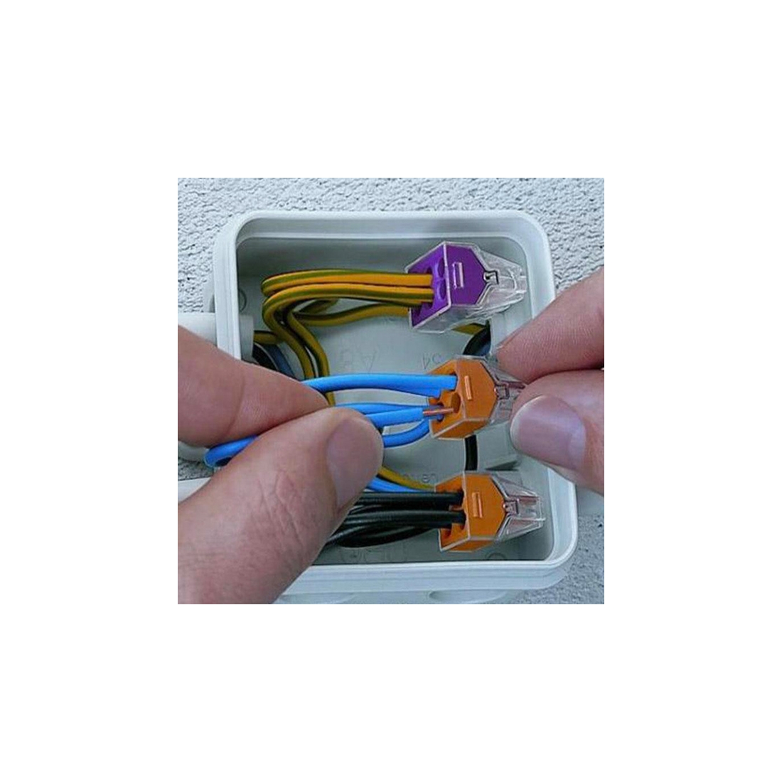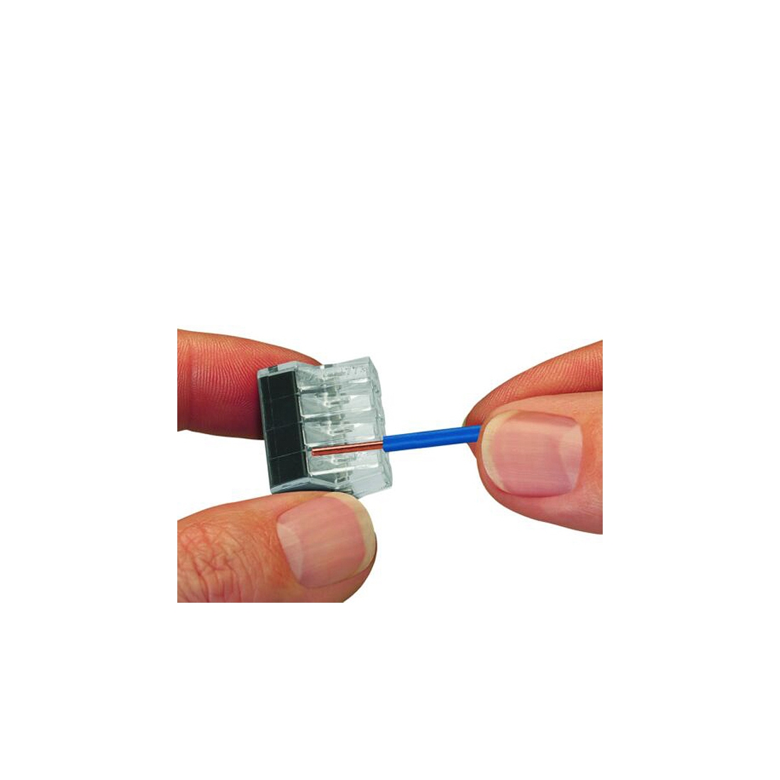 The transparent housing also enables the electrician or installer to see at a glance whether all the conductors have been fully inserted and properly connected. The connector can be reused and wires easily removed.