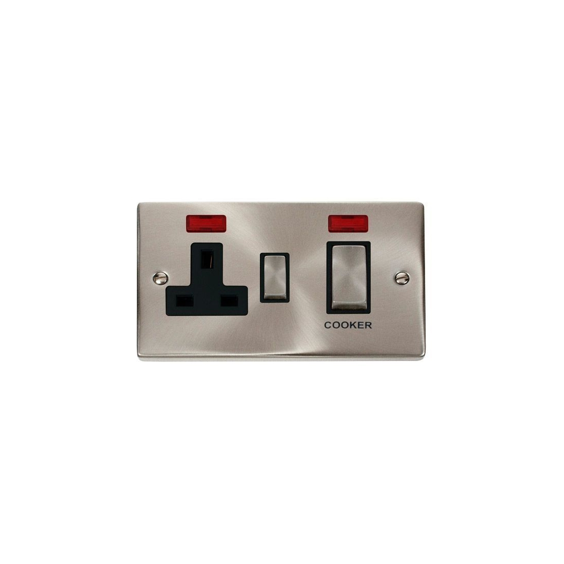 The Click Deco VPSC505BK is a satin chrome 45A ingot style DP cooker control switch with 13A DP switchsocket, neons and black inserts that offers the perfect blend of function and style. Fits a min. 35mm back box for easy installation.