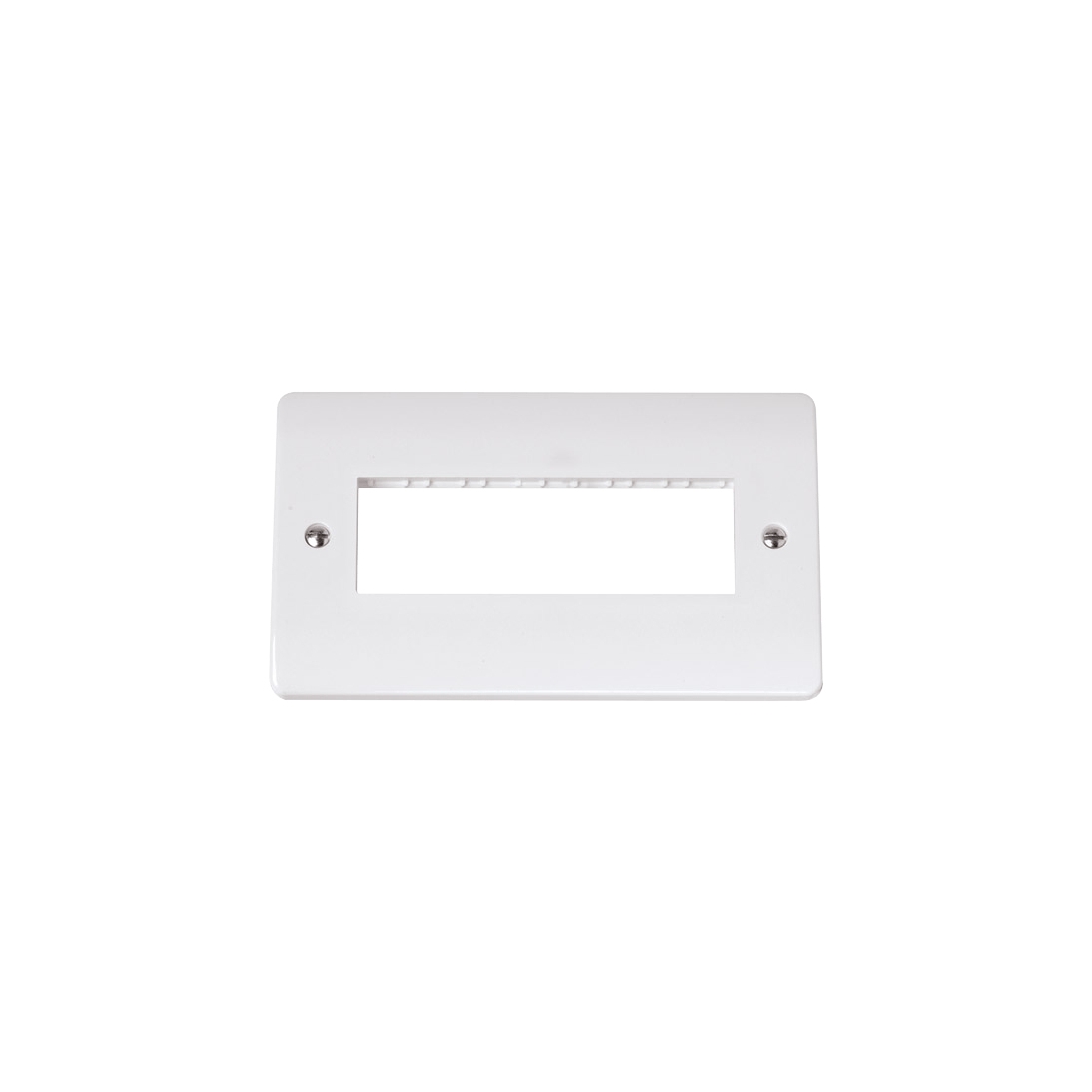 The Click Mode CMA426 is a white moulded 6 module in-line unfurnished MiniGrid frontplate on 2 gang plate. Suitable for use with MiniGrid modules only - shown below.
