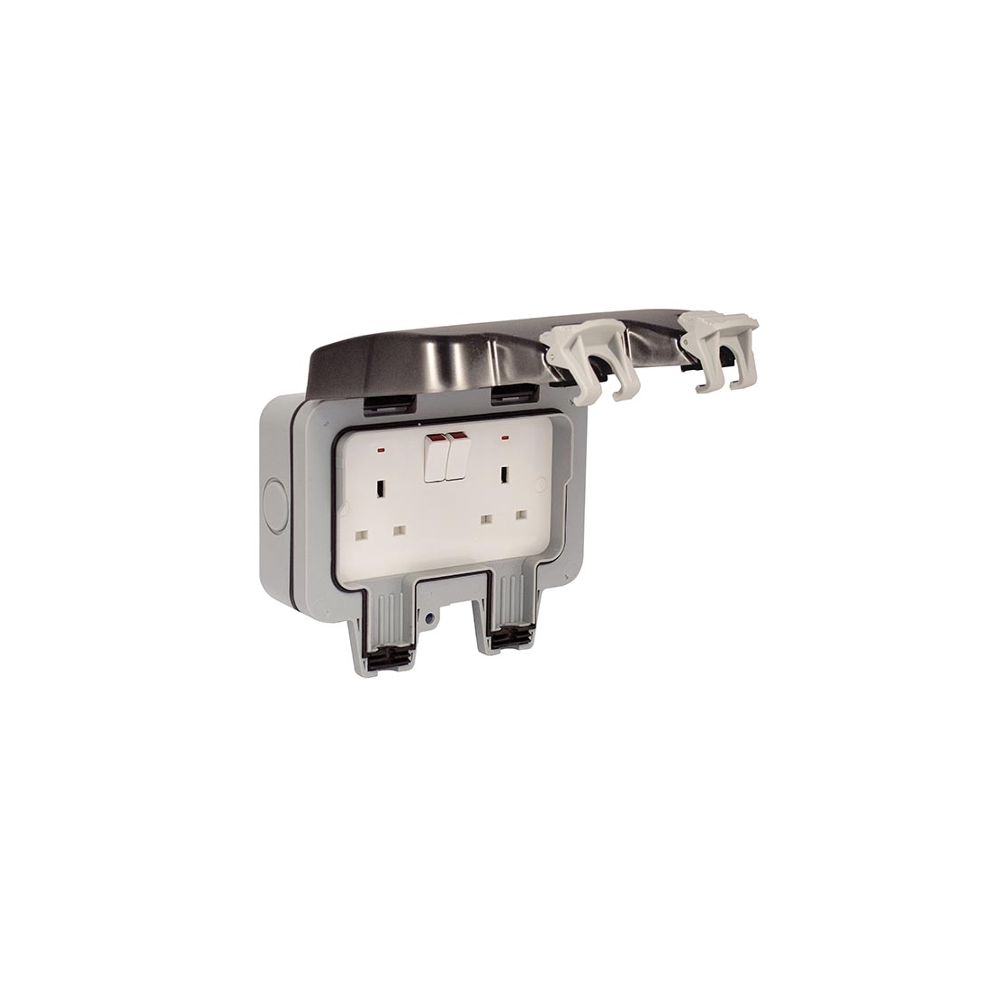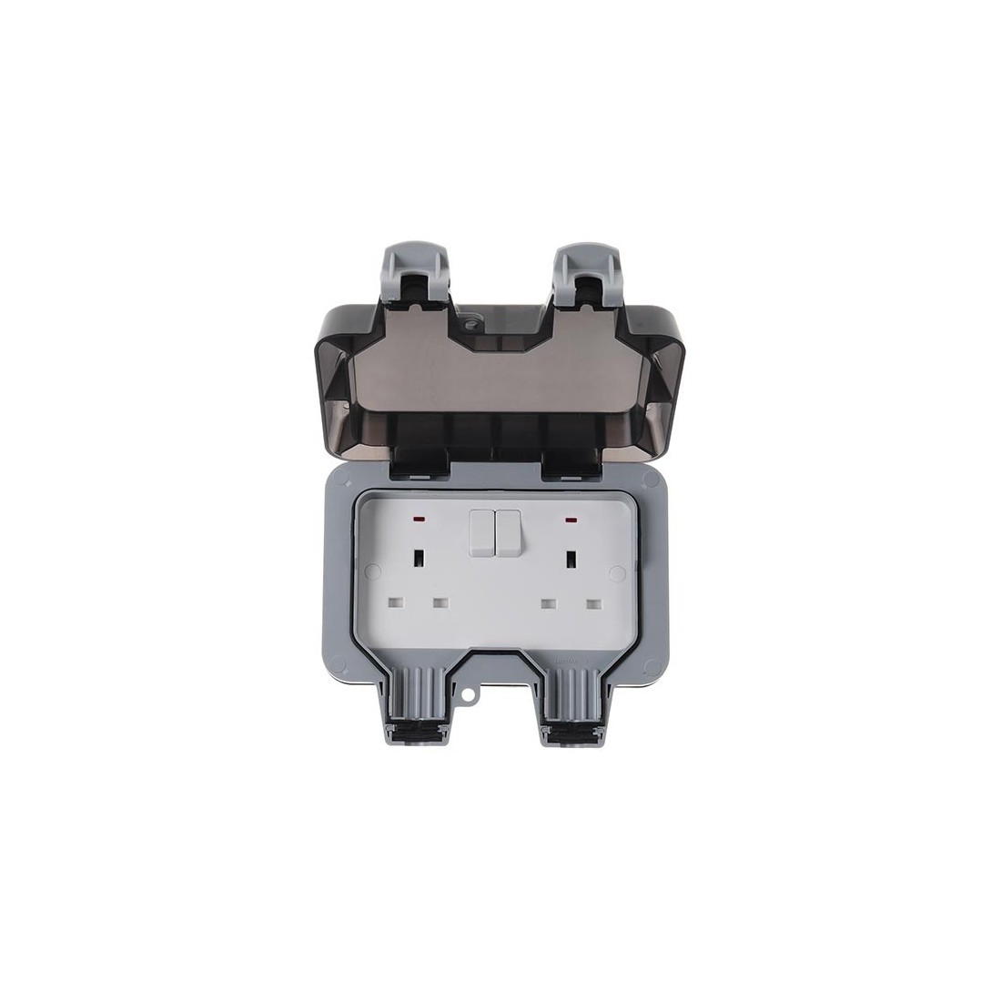 The BG Electrical WP22-PACK (pack of 4) Nexus Storm is a 2 gang double pole switch socket with neon indicator enclosed in grey IP66 polycarbonate weatherproof enclosure that protect the electricity supply from water and dust ingress in the most arduous of conditions.