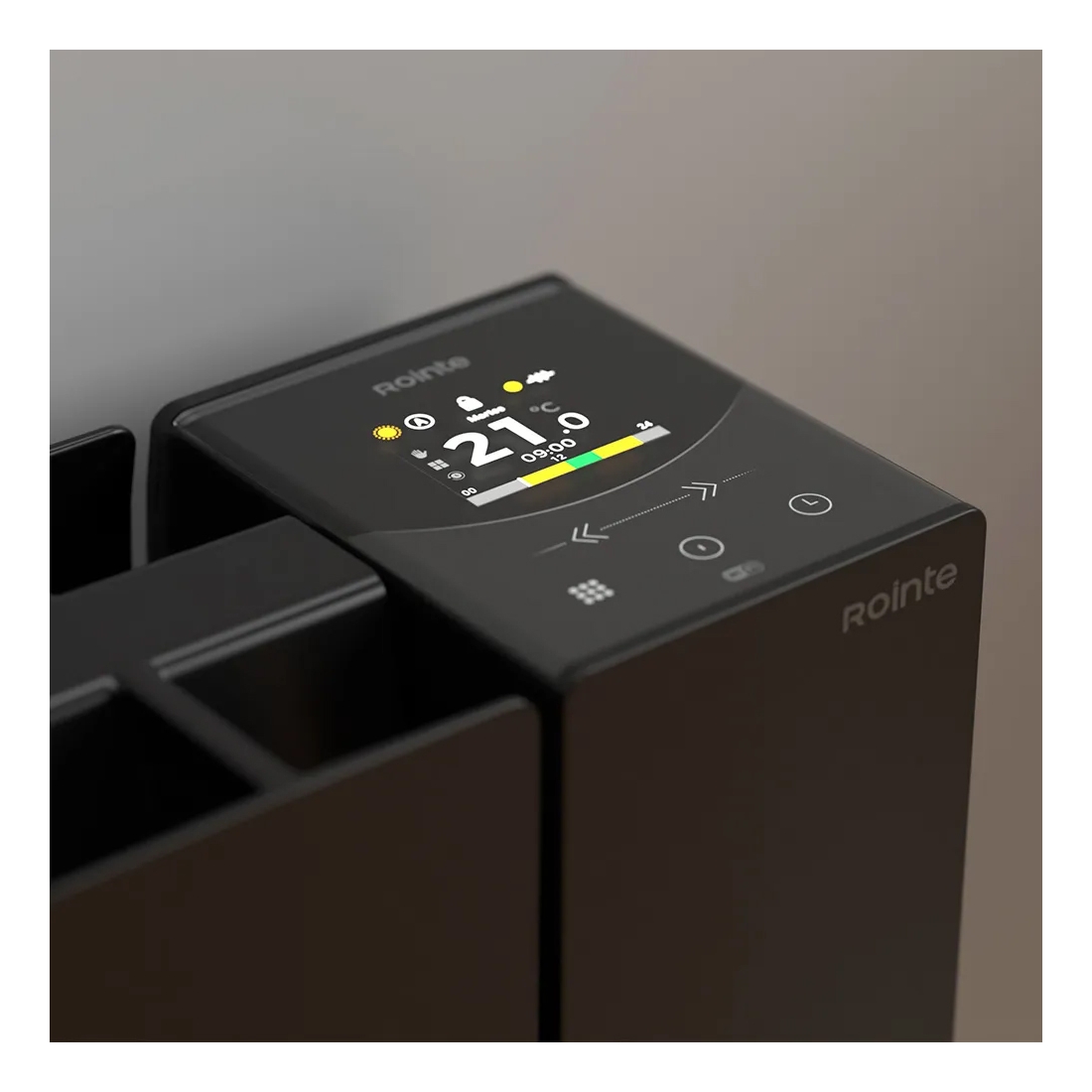 The Rointe BRIB1200RAD3 is a smart 1200 W black Belize inverter electric radiator, offering Wi-Fi control, adaptive efficiency, and low-surface temperature design in a sleek wall-mounted form.
