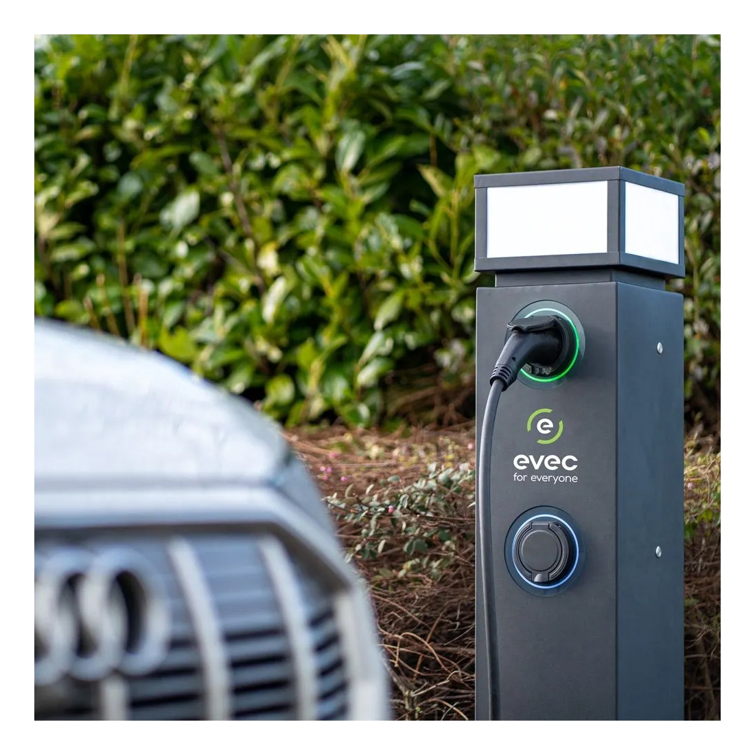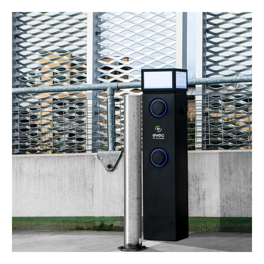 Dual-socket unit, providing two separate untethered Type 2 sockets. This universal design ensures it's compatible with all electric vehicles and plug-in hybrids, allowing users to connect their own charging cables for maximum convenience.