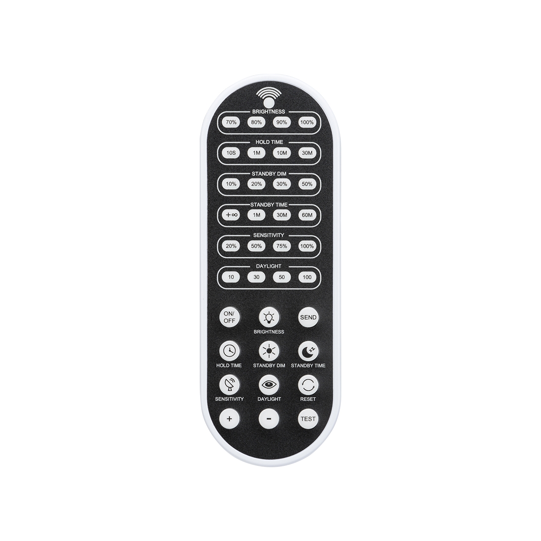 The Knightsbridge POTHBRC is a dedicated programming remote control designed for configuring the POTHBMS microwave sensor used with Potentia LED high bay fittings.