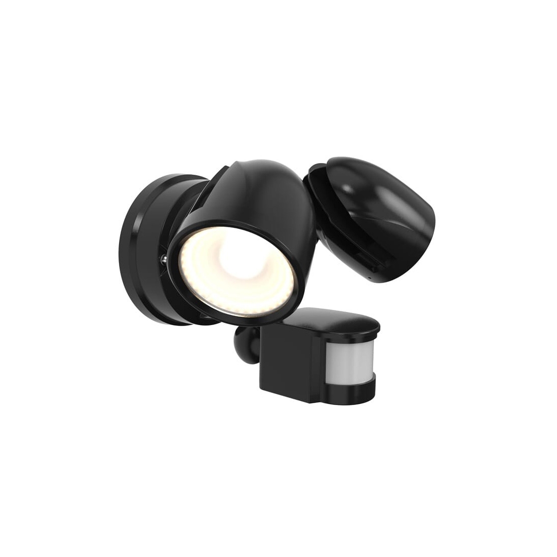 The Ansell Lighting Zeker AZEKER/BL/PIR is an IP54 rated black aluminium compact outdoor adjustable CCT LED twin head spotlight with PIR suitable for residential applications.