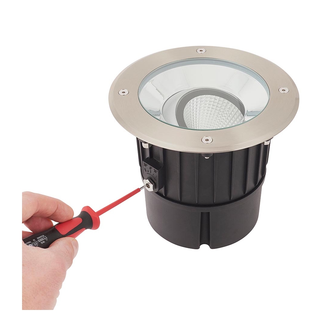 Designed for driveover-rated installation, the fitting is suitable for areas exposed to vehicle traffic. The adjustable LED module allows directional lighting to highlight architectural features, walls, planting or walkways, while the larger 185mm round diameter ensures a strong lighting presence with a clean flush finish in paving or decking.