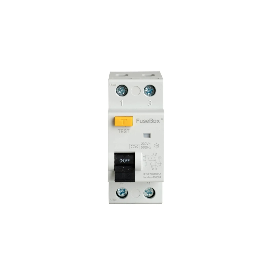 The FuseBox RTA630302 2 module Type A 63A 30mA double pole Residual Current Device (RCD) is typically used as a main incomer to a consumer unit or as a sub-main RCD in commercial or industrial settings. Offers essential protection against earth leakage faults for applications where additional fault protection is required.