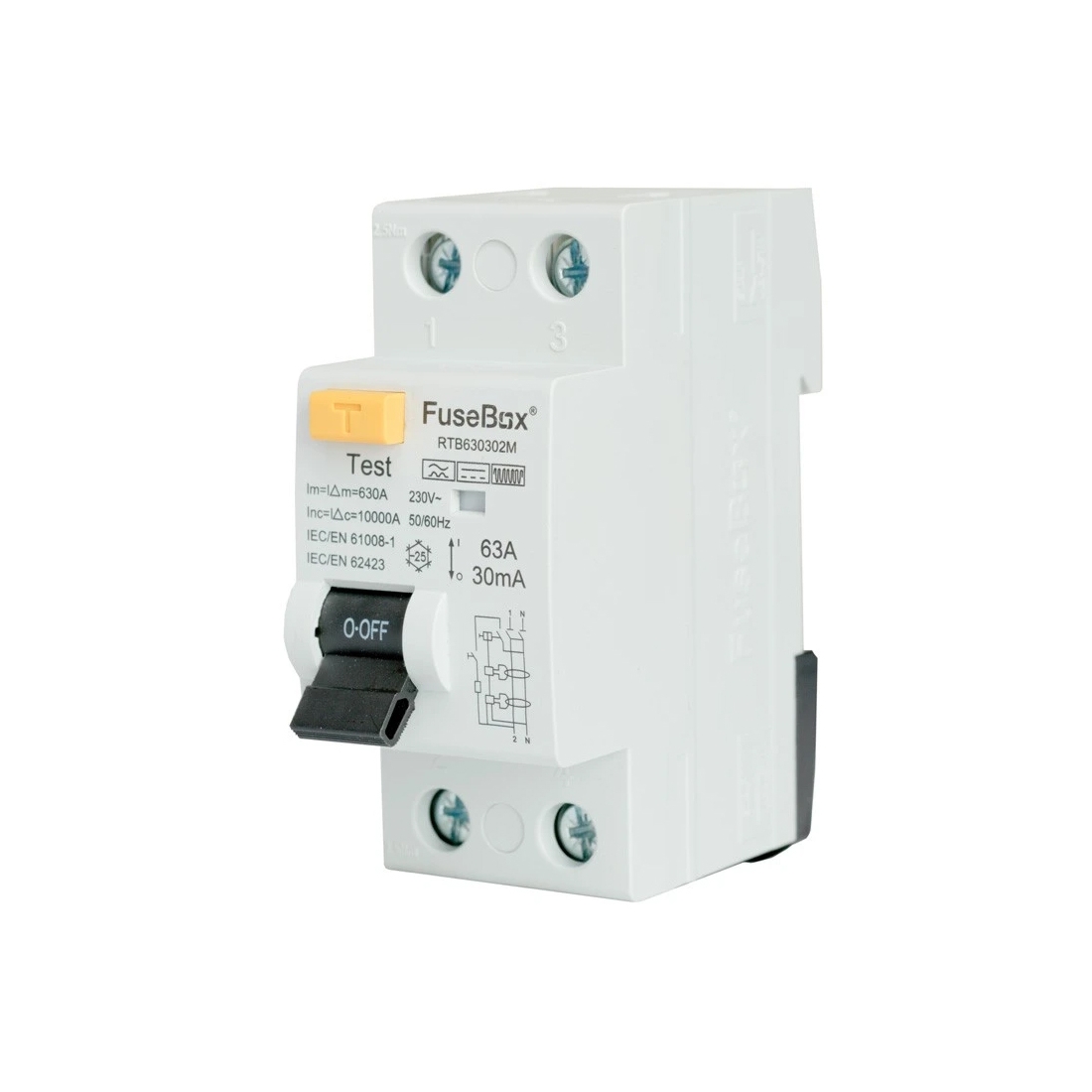 The Fusebox RTB630302M 2 module 32A 30mA Double Pole Type B Residual Current Device RCD designed to provide superior protection against AC, pulsating DC, and smooth DC residual currents. Ideal choice for protecting circuits that produces DC faults, such as electric vehicle (EV) chargers, solar PV systems, and some modern inverter technology.