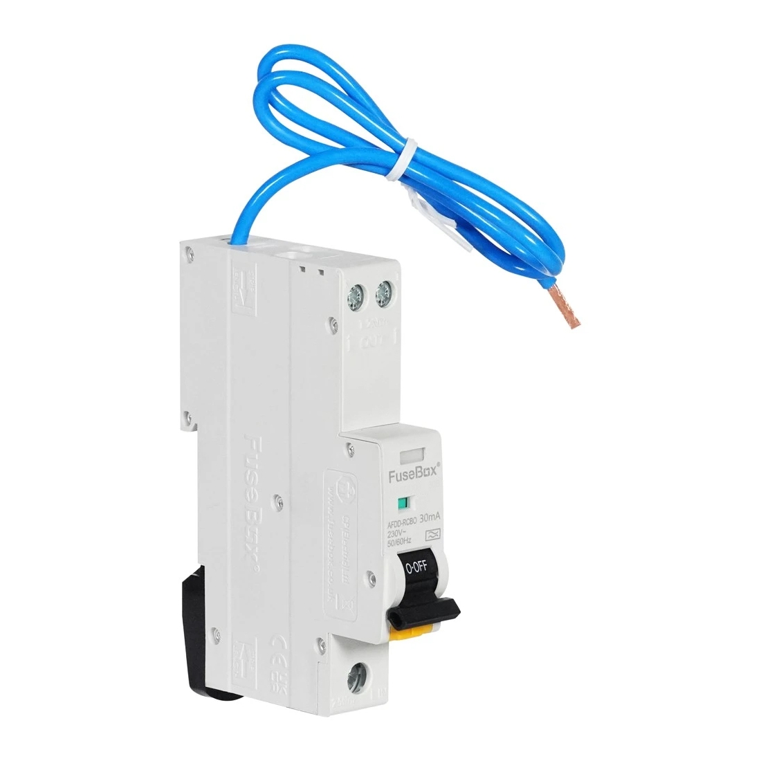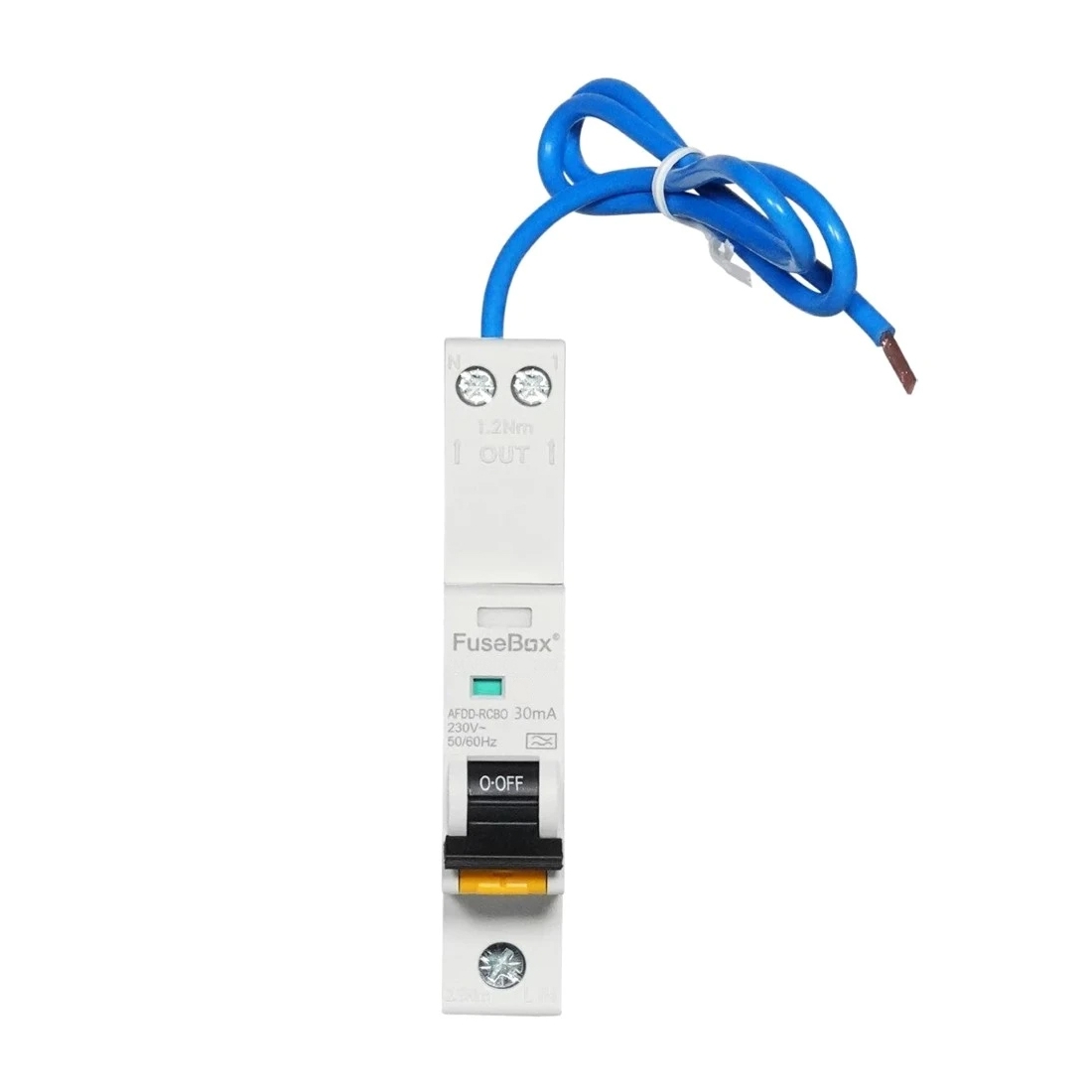 The Fusebox MAFDD061030B 1 module Type A B Curve reduced height 10A 6kA 30mA combined 1P+N switched arc fault detection device (AFDD) detects dangerous arc faults in sensitive electronic equipment, lighting systems, and residential or commercial installations.