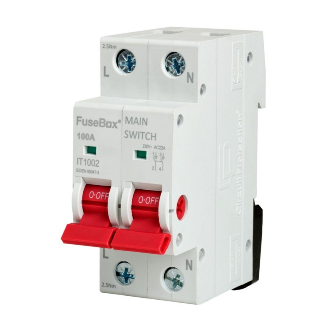 The Fusebox IT1002 is a 100A 2 module double pole switch isolator designed to provide a safe and convenient point of isolation for a wide range of single-phase electrical circuits. Compact, DIN-rail mounted device in consumer units in residential, commercial, and industrial installations.