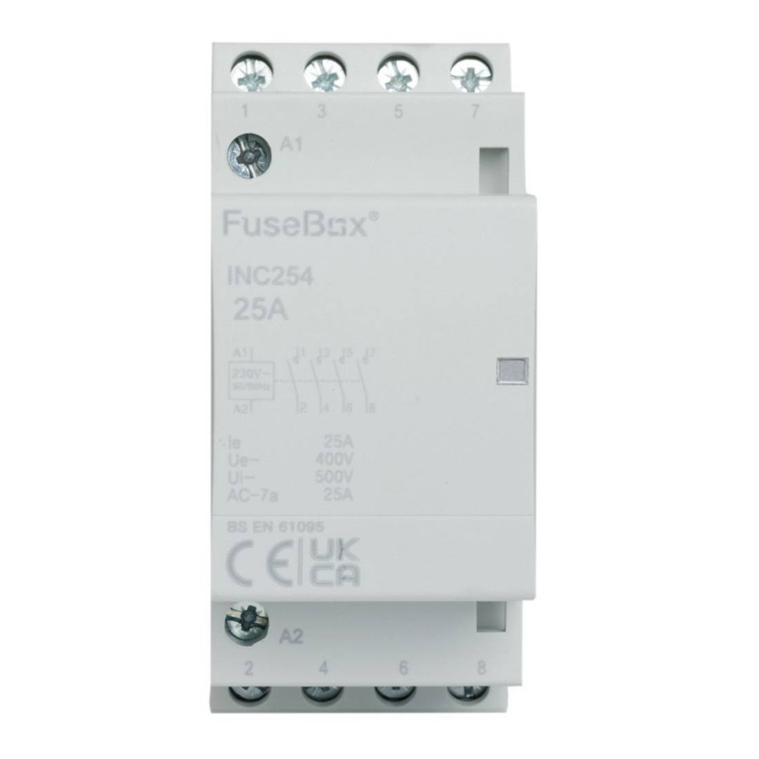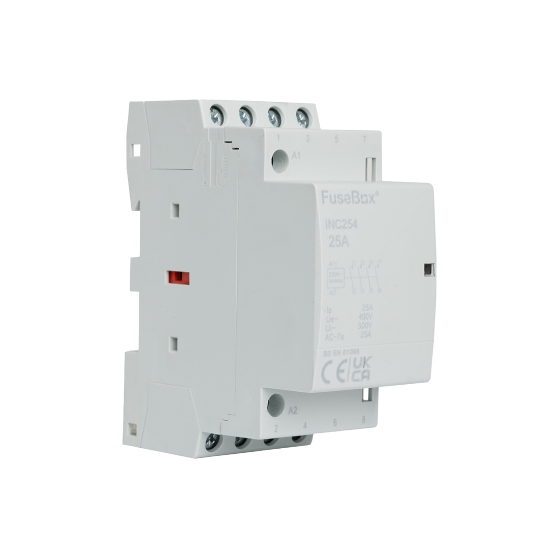 The FuseBox INC254 2 module 25A 415V four pole DIN Rail Contactor is a compact, versatile and reliable switching device designed to provide efficient and remote switching control for a wide range of electrical loads in three-phase installations.
