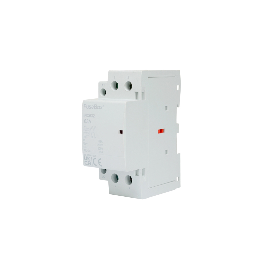 The FuseBox INC632 2 module 63A 230V Double Pole DIN Rail Contactor is a compact, versatile and reliable switching device designed to provide efficient and remote switching control for a wide range of electrical loads.