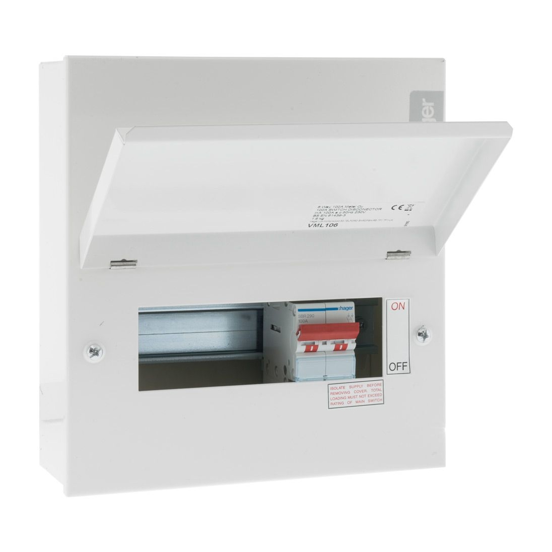 Hager VML106 Design 10 White Metal 18th Edition 6 Way Switch Isolator Consumer Unit With 100A Isolator Width: 227mm | Height: 246mm | Depth:100mm