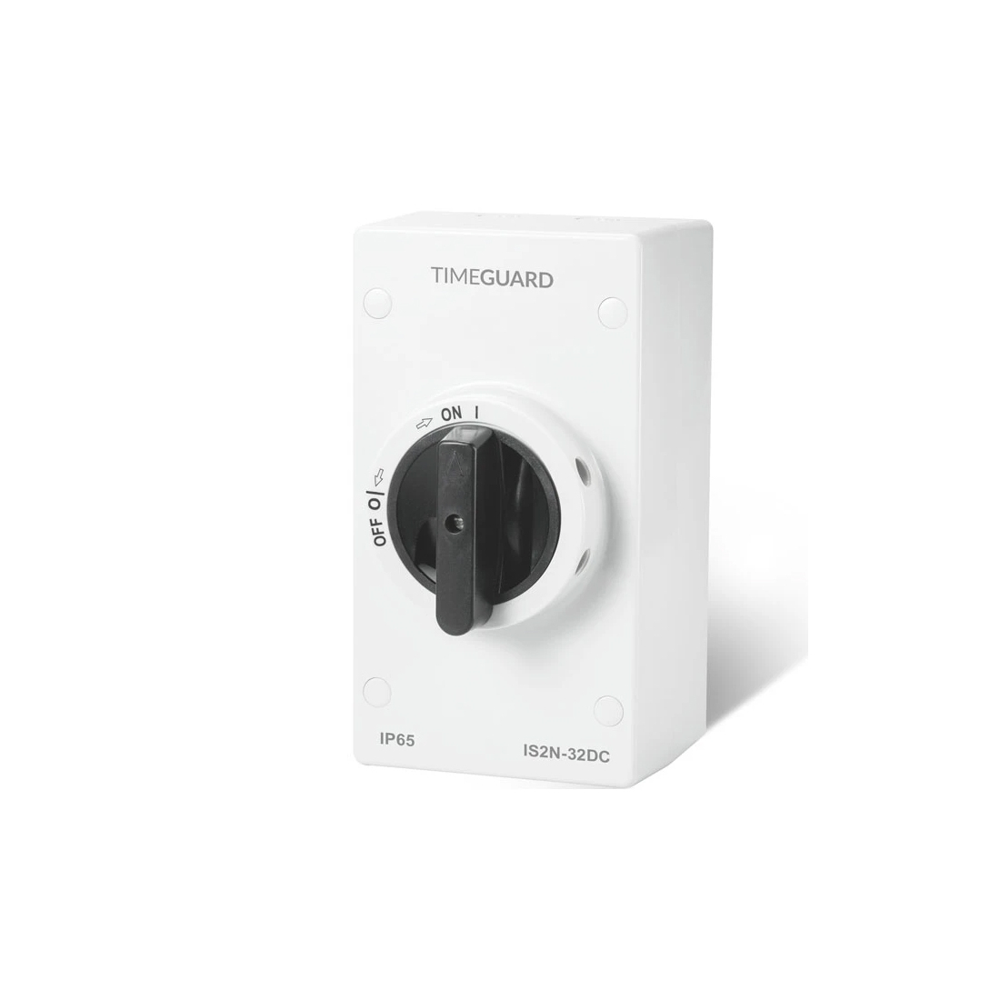 The Timeguard IS2N-32DC is an IP65-rated 2-Pole 32 A DC Rotary Isolator Switch designed for safe isolation and disconnection of high-current DC power circuits in renewable and battery-powered systems.