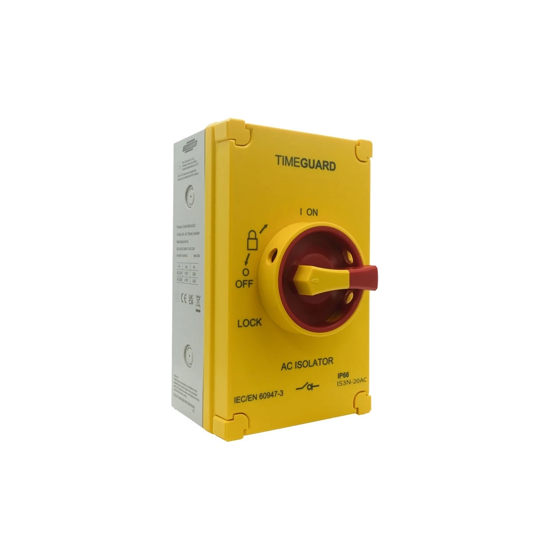 The Timeguard IS3N-20AC is a weatherproof IP65 3-Pole 20 A AC rotary isolator switch, engineered for safe and reliable isolation of AC mains circuits in demanding environments
