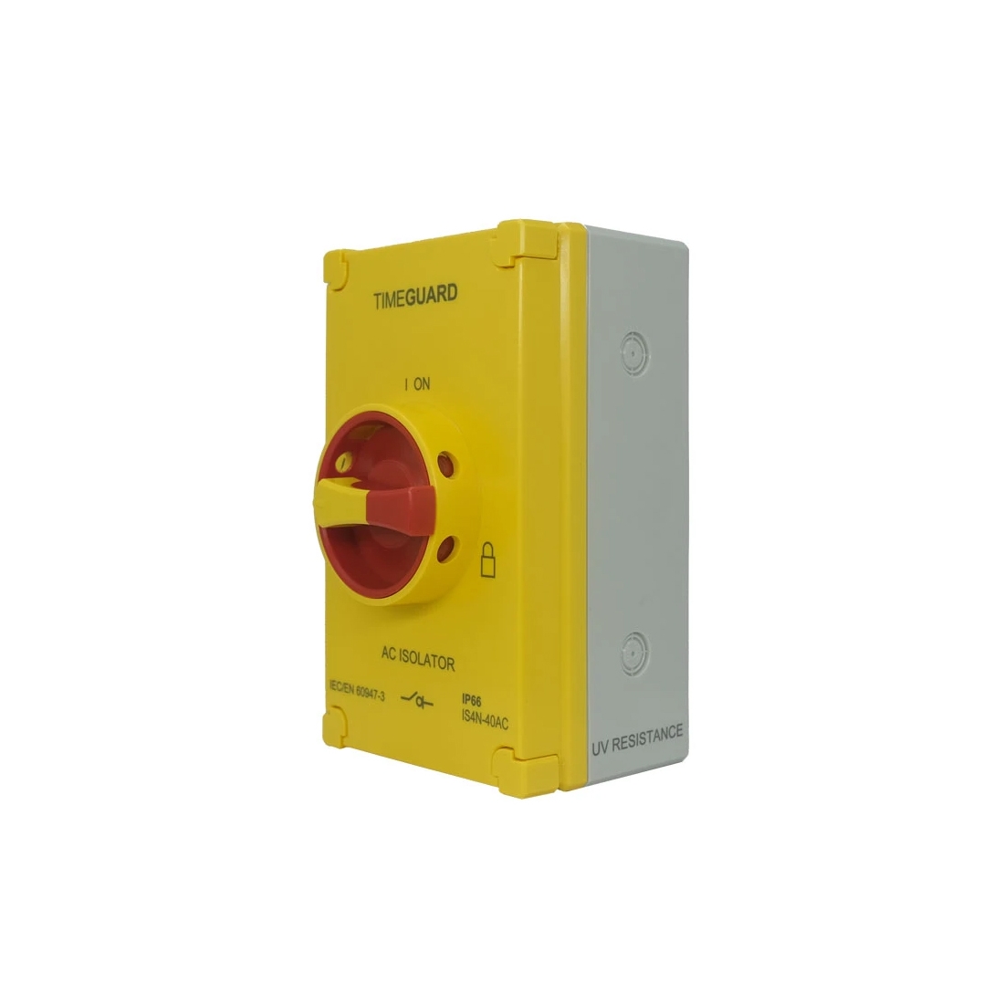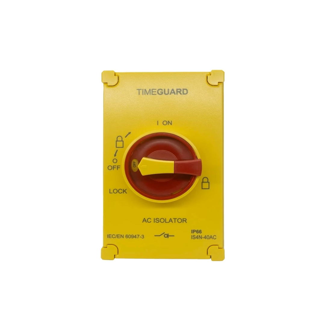 The Timeguard IS4N-40AC is a weatherproof IP66 4-pole 40 A AC rotary isolator switch designed to provide safe, dependable isolation and disconnection of AC mains circuits in industrial, commercial and outdoor electrical systems.