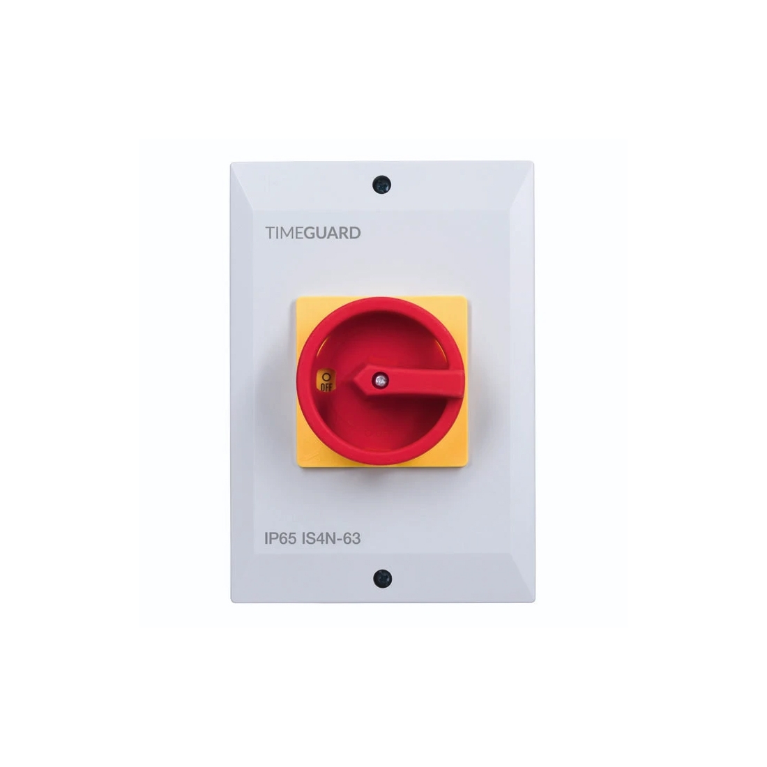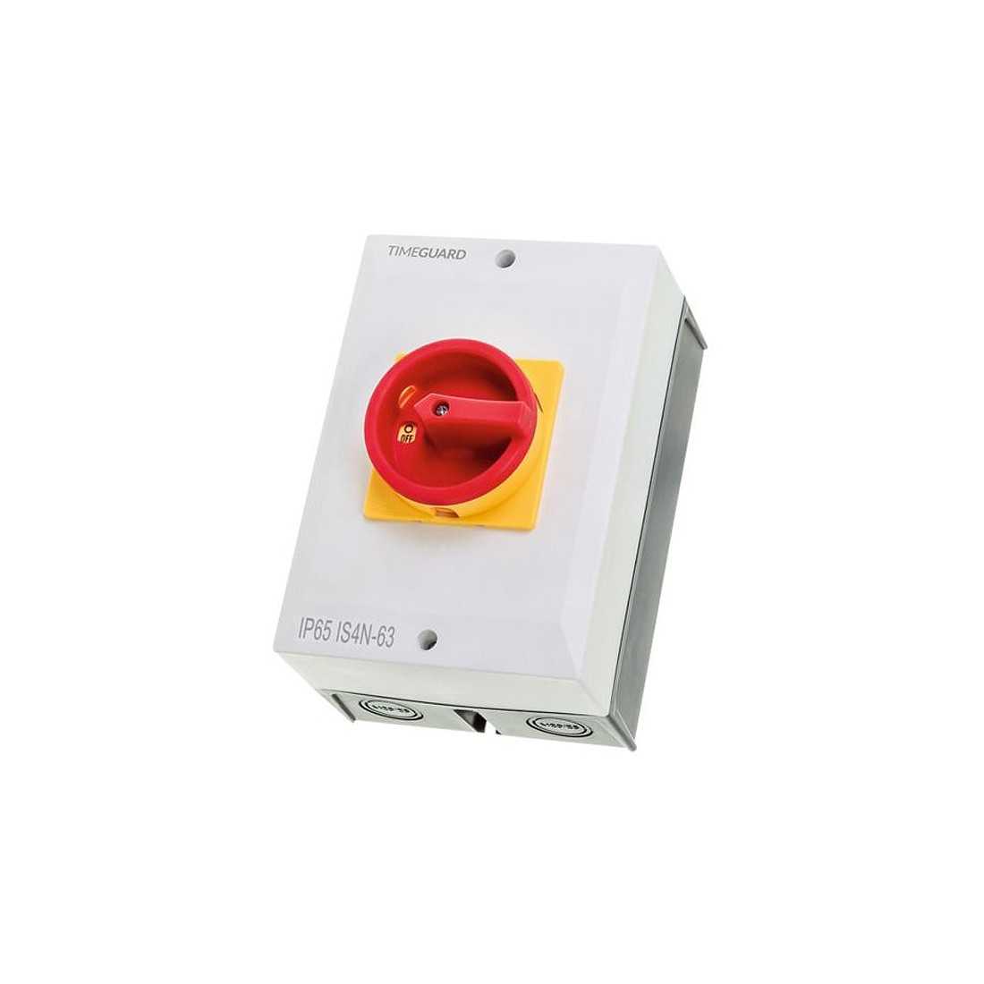 The Timeguard IS4N-63 Weathersafe 63A 230V four pole enclosed rotary isolator switch is designed with safety in mind, the interlocked front covers can only be removed when in OFF position.