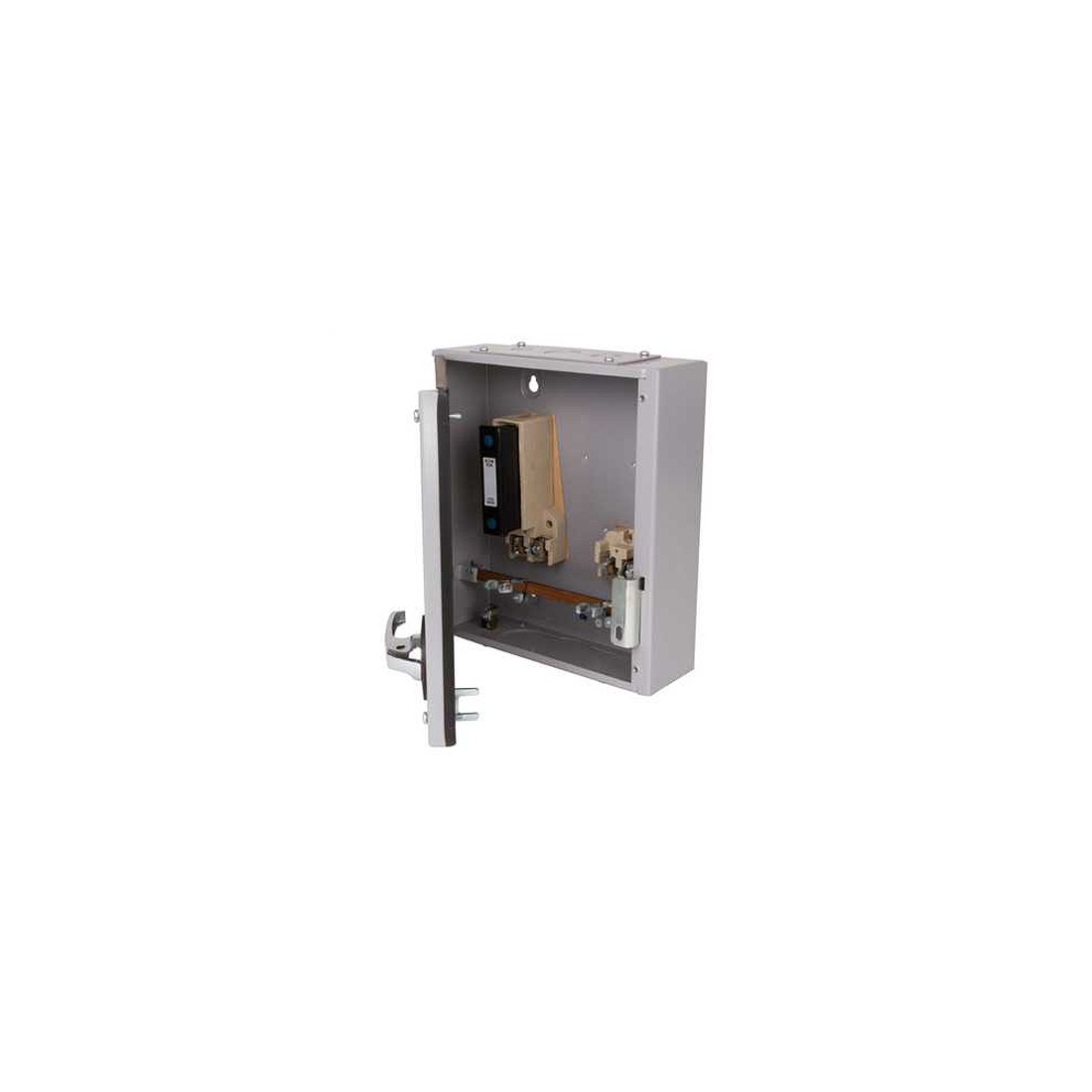 Surface mounted and fabricated from rust-protected sheet steel with a light grey paint finish. Supplied with removable top and bottom endplates incorporating knockouts and gasketed doors giving IP41 protection. Chromium-plated, front-operated handle with with 'ON (I) OFF (O)' indicators. Internal fixing enabling units to be mounted closely side-by-side.
