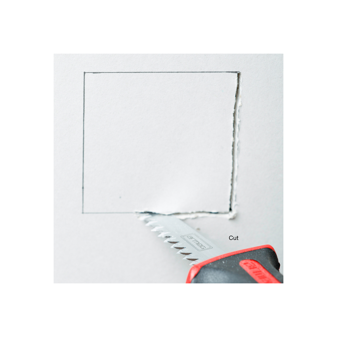 This plasterboard saw provides structural durability with a 1.8mm fully hardened, high carbon steel blade produces a stable sawing action and ultimate tool durability. The 15mm straight 'Punch Tip' blade punches through materials prior to sawing enabling immediate cutting for a hassle free and time saving start-up. The dual ground teeth at a perfect 7 TPI ratio provides an aggressive sawing action on both the push and pull strokes for extreme speed and fast hole production.