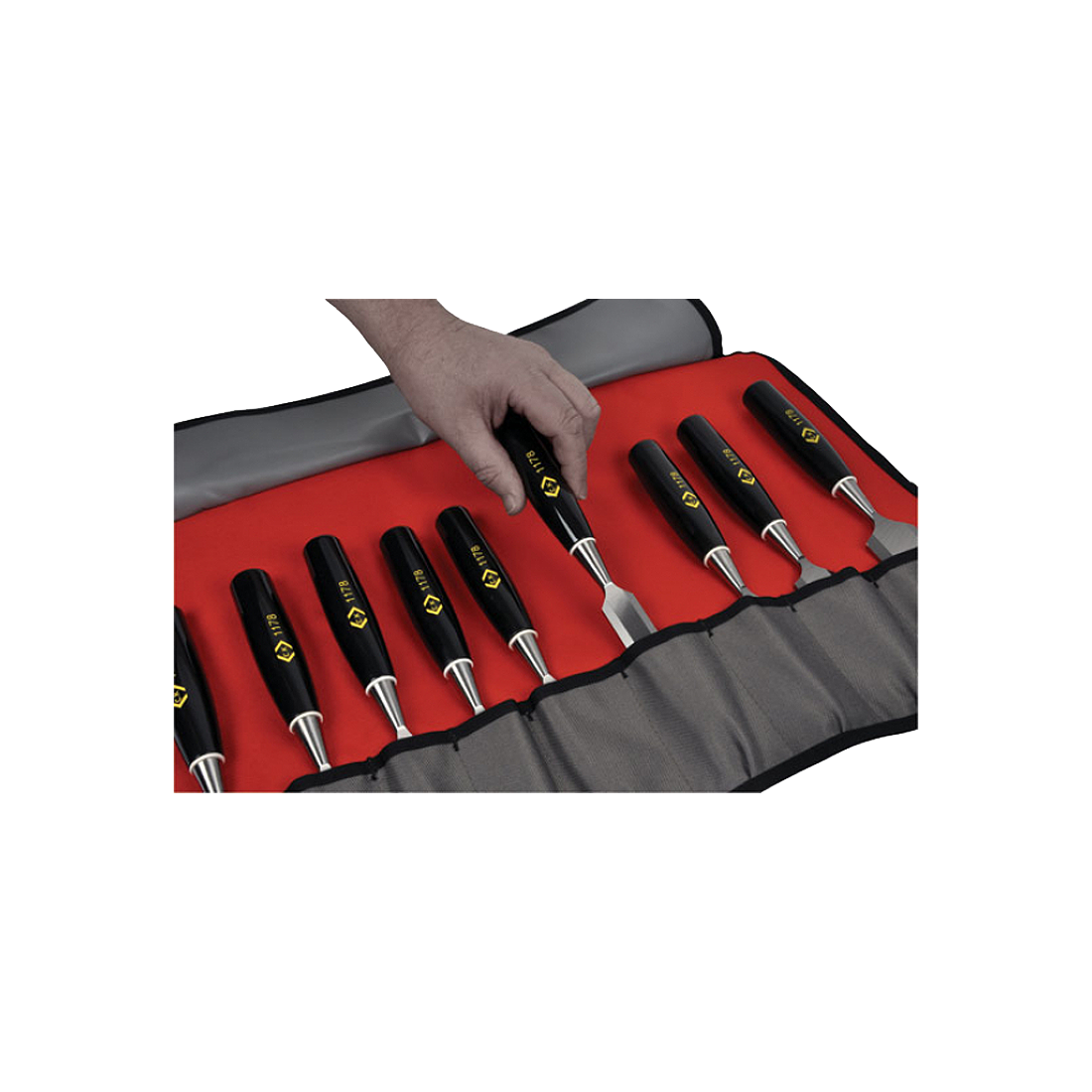 • Stores up to 9 chisels • Padded handle